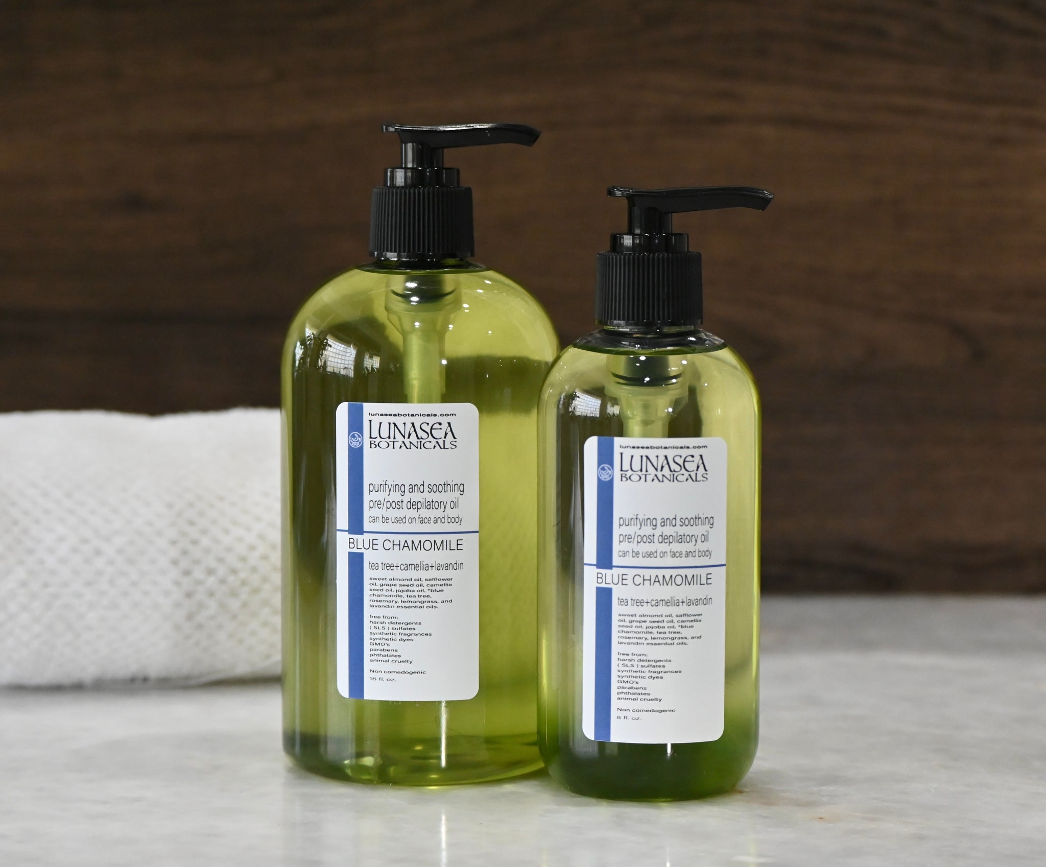 Blue Chamomile Purifying and soothing oil pre and post-depilatory service helps to keep down ingrown hairs, and bacteria and helps remove residue.