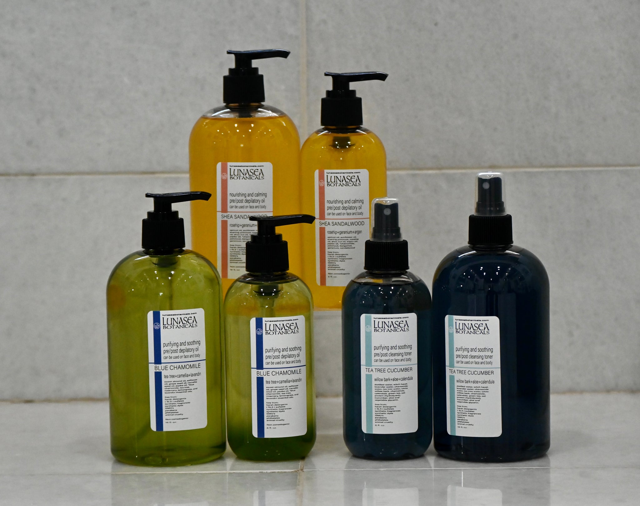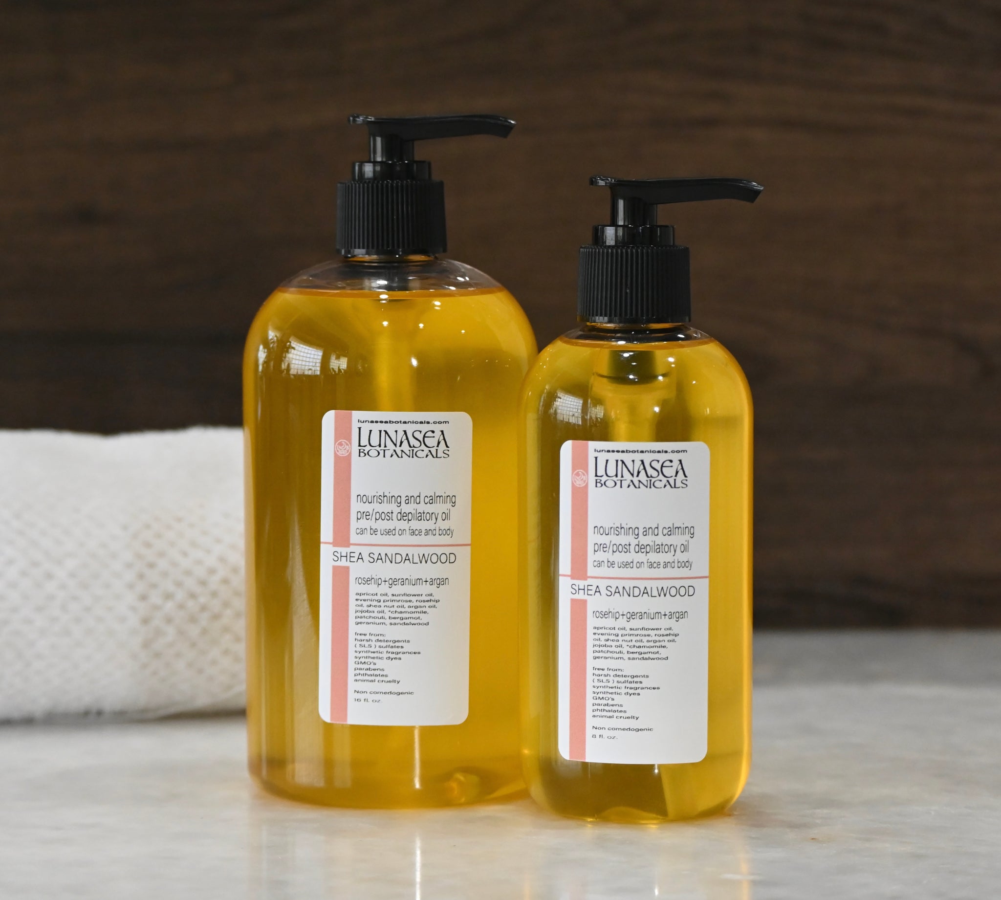 Shea Sandalwood Pre/post-depilatory removes wax residue while it calms and nourishes your skin.