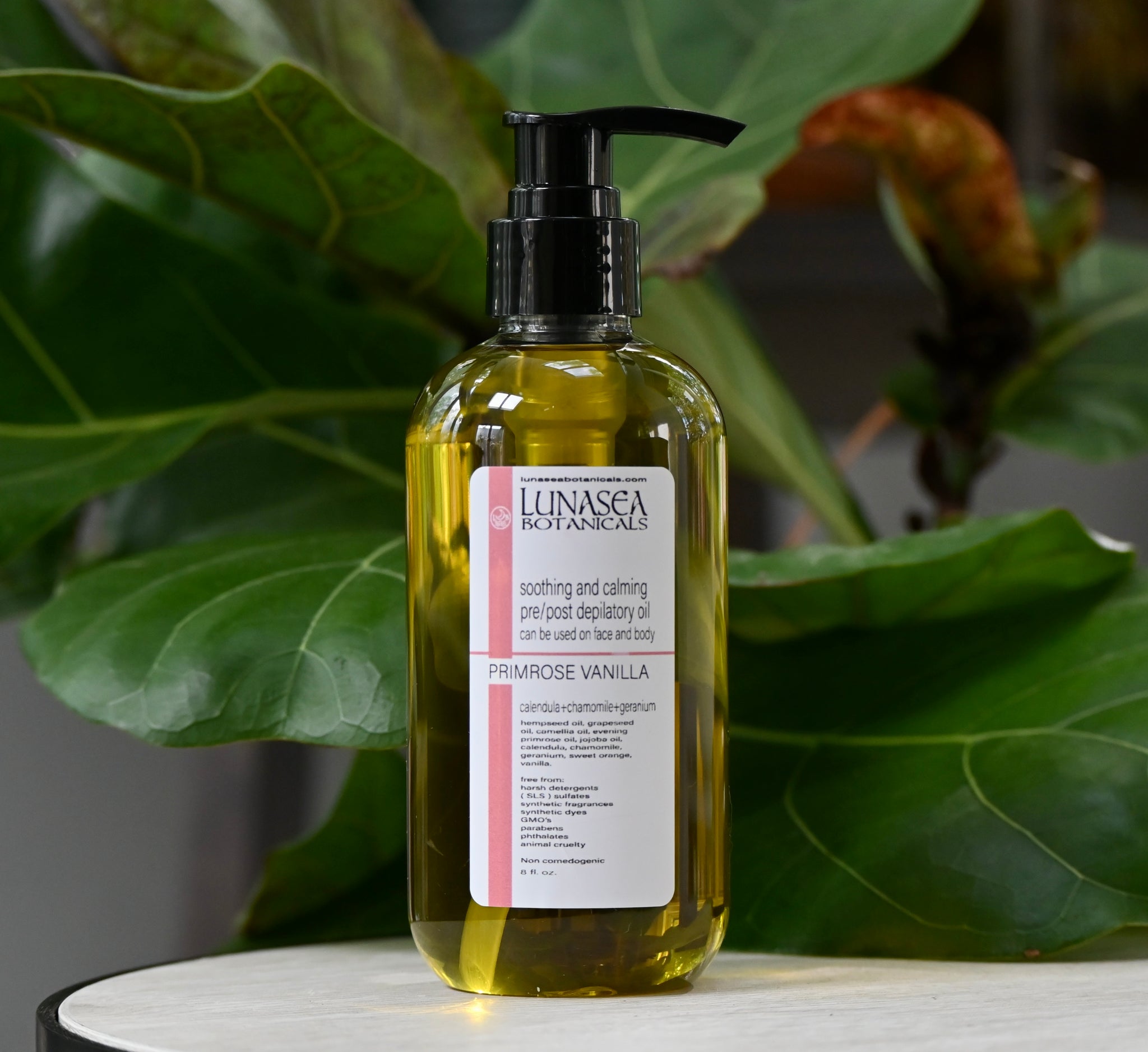Primrose Vanilla soothing and calming oil with calendula helps skin stay nouriseh and soft before and after waxing.